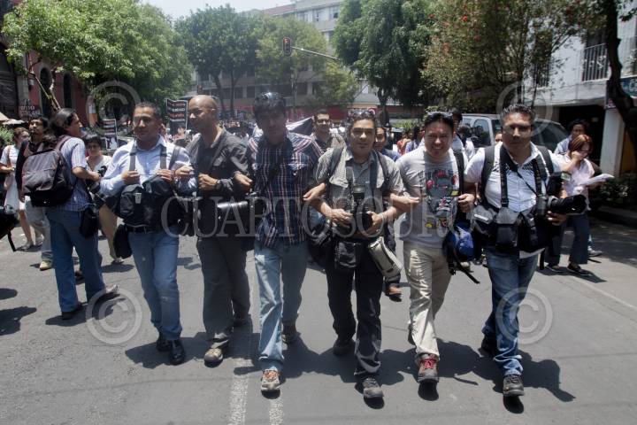 MÉXICO, D.F., 04MAYO2012.- Periodistas de diversos medios de comunicación se manifestraron en la Secretaría de Gobernación, donde entregaron un documento para exigir el esclarecimiento de los recientes asesinatos de reporteros en diversas partes del país, así como un pliego petitorio para garantizar el desarrollo del ejercicio periodístico. FOTO: JUAN PABLO ZAMORA /CUARTOSCURO.COM
