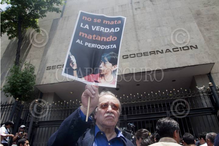 MÉXICO, D.F., 04MAYO2012.- Periodistas de diversos medios de comunicación se manifestraron en la Secretaría de Gobernación, donde entregaron un documento para exigir el esclarecimiento de los recientes asesinatos de reporteros en diversas partes del país, así como un pliego petitorio para garantizar el desarrollo del ejercicio periodístico. FOTO: JUAN PABLO ZAMORA /CUARTOSCURO.COM