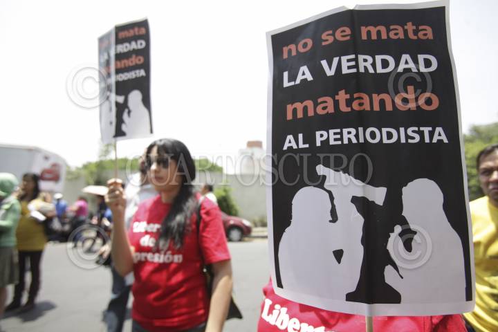 MÉXICO, D.F., 04MAYO2012.- Periodistas de diversos medios de comunicación se manifestraron en la Secretaría de Gobernación, donde entregaron un documento para exigir el esclarecimiento de los recientes asesinatos de reporteros en diversas partes del país, así como un pliego petitorio para garantizar el desarrollo del ejercicio periodístico. FOTO: JUAN PABLO ZAMORA /CUARTOSCURO.COM