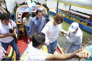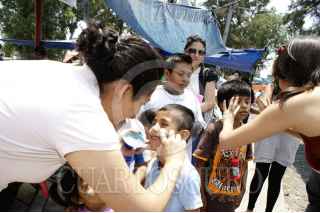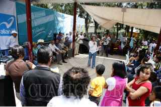 MÉXICO, D.F., 05MAYO2012.- Afiche de Gabriel Quadri, candidato a la presidencia de la república por el PANAL en la bolsa de la camisa de Carlos Del Valle; presidente del PANAL-DF siendo observado por Rosario Guerra, candidata a la Jefatura de gobierno del Distrito Federal por el Partido Nueva Alianza, durante un mitin en Tlahuac. FOTO: NIMROD CRUCES /CUARTOSCURO.COM