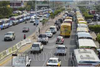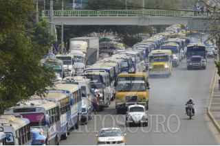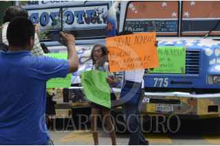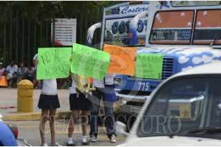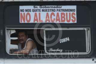 ACAPULCO, GUERRERO, 08MAYO2012.- Choferes y concesionarios de camiones urbanos protestaron de forma masiva y pacífica por lapso de cinco horas contra el sistema de transporte colectivo; Acabús, en dos puntos distintos del municipio en la costera Miguel Alemán. En el bulevar Vicente Guerrero, principal acceso carretero a Acapulco, alrededor de 160 camiones urbanos se estacionaron en las laterales de la vía, sin bloquear la circulación de forma total, mientras que los operadores sostenían cartulinas con leyendas de inconformidad contra el gobernador Ángel Aguirre Rivero, a quien exigen sostener una mesa de trabajo para conocer detalles del proyecto, cuyos trabajos comenzaron en marzo pasado. De igual forma, los inconformes apostaron 60 camiones urbanos en la avenida Costera Miguel Alemán, a la altura del asta bandera. En algunas cartulinas se leía: "Señor gobernador no nos robe nuestro empleo". FOTO: BERNANDINO HERNÁNDEZ /CUARTOSCURO.COM