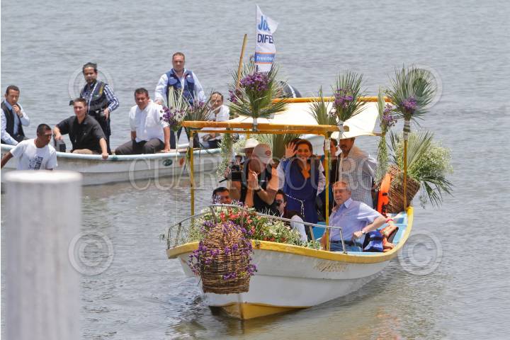JOCOTEPEC, JALISCO, 11MAYO2012.- Josefina Vázquez Mota, candidata a la Presidencia de la República por el PAN, encabezó un mitin proselitista frente al Lago de Chapala, donde se reunió además con pescadores, en el marco de su gira de campaña por este estado de la República. FOTO: ISAAC ESQUIVEL /CUARTOSCURO.COM