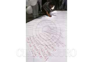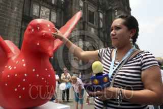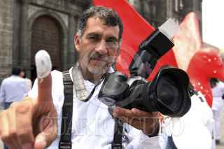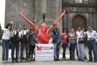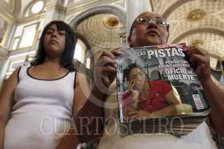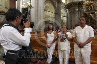 PUEBLA, PUEBLA., 12MAYO2012.- Periodistas poblanos celebraron misa en honor de los comunicadores acaecidos en el vecino estado de Veracruz, asimismo se manifestaron pacíficamente y colocaron su huella con pintura blanca en una paloma de la paz colocada en el atrio de catedral. FOTO: HILDA RIOS /CUARTOSCURO.COM