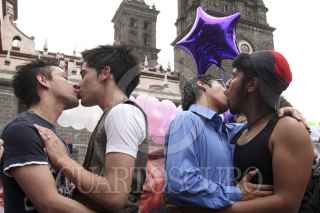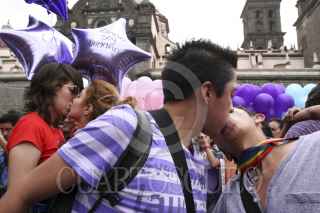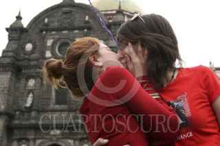PUEBLA, PUEBLA., 17MAYO2012.- Organizaciones lésbico-gay del estado, organizaron el Besatón en el zócalo de la ciudad, para pedir hoy Día Internacional contra la Homofobia, se erradique la violencia contra la comunidad LGBTTI. FOTO: HILDA RIOS /CUARTOSCURO.COM