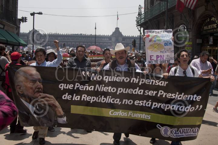 MÉXICO, D.F., 19MAYO2012.- Estudiantes de la UNAM, IPN, IBERO, sociedad civil y algunas organizaciones sociales; realizaron la Marcha Anti Peña Nieto, convocada por las redes sociales para repudiar la posibilidad del regreso al poder del Partido Revolucionario Institucional y de su candidato Enrique Peña Nieto. Con consignas como "Todos somos Atenco", "ni un voto al PRI, ni PAN, ni PRD"; los manifestantes, en su mayoría jóvenes, caminaron del Zócalo a el Ángel de la independencia y de regreso. FOTO: ADOLFO VLADIMIR/CUARTOSCURO.COM
