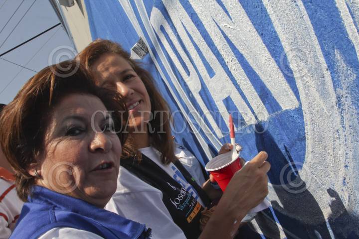 MÉXICO, D.F., 20MAYO2012.- Isabel Miranda de Wallace, candidata del PAN a la jefatura de gobierno junto a la primera dama, Margarita Zavala, durante la pinta de bardas que realizaron durante las primeras horas de la mañana. FOTO: ENRIQUE ORDÓÑEZ /CUARTOSCURO.COM