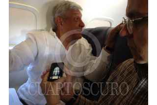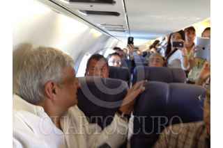 MÉXICO, D.F., 22MAYO2012.- Andrés Manuel López Obrador, candidato a la presidencia de la república por el "Movimiento Progresista", improviso un mitin a 36000 pies de altura. Después de que algunos pasajeros se lo solicitaran, desde el asiento 6C del vuelo 2596 de Aeromexico, Ciudad de México-Reynosa Tamaulipas, Lopez Obrador explicó sus propuestas y como piensa cambiar al país. FOTO: ELEAZAR TORRES/CUARTOSCURO.COM