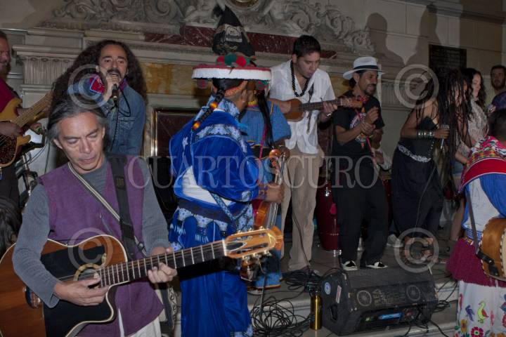 MÉXICO, D.F., 22MAYO2012.- Rubén Albarrán, vocalista de Café Tacuva, Venado Azul y su esposa, indigenas Wixarika, Moyeney Valdéz, vocalista de Sonidero Meztizo y Rocco, exvocalista de La Maldita Vecindad y los Hijos del Quinto Patio, todos miembro del colectivo AHO, ofrecieron conferencia de prensa con motivo del Wirikuta Fest, próximo a realizarse el 26 de este mes en el Foro Sol, el movimiento pretende denunciar la acción de las mineras canadienses en territorio wixarika para extraer metales preciosos en zona sagrada para este pueblo indigena, con la anuencia de los gobiernos estatales y federales. Los fondos se prentenden destinar a proyectos de desarrollo y a la defensa de la zona sagrada. FOTO: FRANCISCO RODRÍGUEZ /CUARTOSCURO.COM