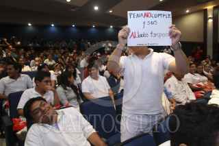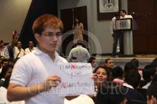 VILLAHERMOSA, TABASCO, 22MAYO2012.- Jesús Alí de la Torre de la coalición "Compromiso por Tabasco" presento su propuesta de gobierno a estudiantes de la UAG campus Villahermosa, donde en más de una ocasión alumnos le mostraron su apatía "PENA NO CUMPLE y sus ALIados tampoco" FOTO: MARCO POLO GUZMÁN HERNÁNDEZ /CUARTOSCURO.COM