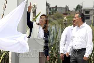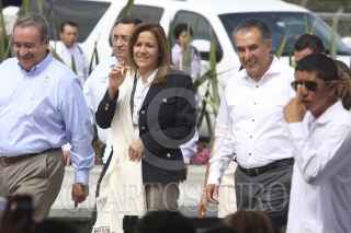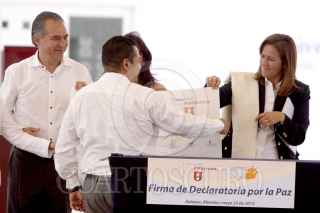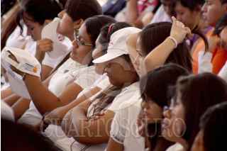 JIUTEPEC, MORELOS, 23MAYO2012.- En el marco del día del estudiante Margarita Zavala visitó esta mañana la Universidad Politécnica del Estado de Morelos (UPEMOR), donde recibió una carta compromiso de manos de una representante de los estudiantes donde se comprometían a promover la paz y evitar dentro se su institución cualquier tipo de acto violento, en este mismo evento se firmó una declaratoria por la paz. Para finaliza tuvo lugar el abanderamiento de las Comunidades Educativa Libres de Violencia, mientras la primera dama entonaba la canción “color esperanza”. FOTO: ALMA LAFAYET /CUARTOSCURO.COM