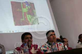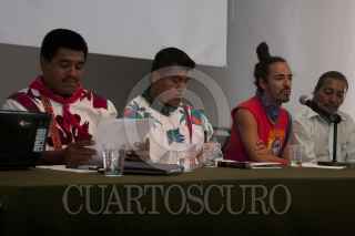 MÉXICO, D.F., 25MAYO2012.- En conferencia de prensa, representantes del Frente en Defensa de Wirikuta, acompañados de Rubén Albarran, dieron su pronunciamiento después del anuncio del gobierno federal de protección a Wirikuta. Los indígenas wirarikas consideraron que la respuesta del gobierno es incompleta y llena de datos falsos que distorsionan la realidad del lugar sagrado. Los representantes que estuvieron con el secretario de gobernación no tenían representación del pueblo wirarika y los pueblos no fueron consultados de la decisión. FOTO: ADOLFO VLADIMIR /CUARTOSCURO.COM
