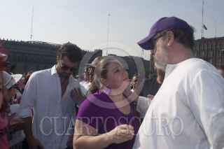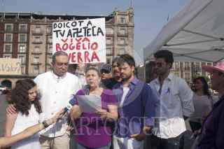 MÉXICO, D.F., 26MAYO2012.- El abogado, Alvaro Duarte Cue, la esposa del actor, Rogelio Guerra, la señora Maribel de Guerra y sus hijos, Carlo y Aldo Guerra explican con comunicado a los simpatizante del actor la razón por la cual no se presentó a la marcha convocada para este Sábado, en su apoyo debido a que Azteca Novelas le pidió al actor llegar a un acuerdo y que para que este llegara a buen término el debía desistirse de acudir al Zócalo esta mañana. Rogelio Guerra perdió un juicio contra la televisora del Ajusco por incumplimiento de contrato, por lo que la empresa se queda con el nombre artisitico de Hildegardo Francisco Guerra Martinez, su verdadero nombre, además deberá pagar una suma cercana a los 36 millones de pesos, por lo que estaban a punto de perder su casa por embargo de la televisora. La esposa de Rogelio Guerra agradeció las muestras de apoyo y pidio a los simpatizantes que acudieron a la plaza de la Constitución esperar a que concluyan las negociaciones. FOTO: FRANCISCO RODRÍGUEZ /CUARTOSCURO.COM
