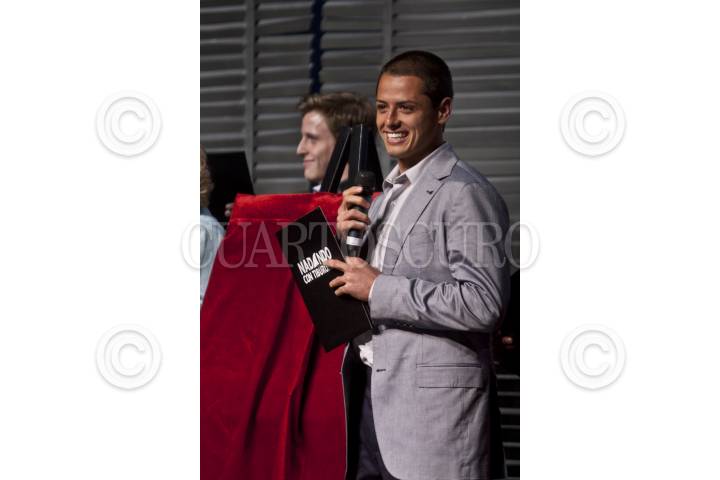 MÉXICO, D.F., 26MAYO2012.- En medio de malos entendidos entre medios de comunicación y la producción de la obra de Teatro "Nadando entre Tiburones" se develó la noche de hoy la placa conmemorativa de las 100 representaciones, acción que realizó el jugador de futbol, Javier "El Chicharito" Hernández, quien entró y salió sin saludar a sus admiradores que lo esperaron más de dos horas en espera de un autógrafo y sin dar declaraciones a la prensa por la puerta de atrás del Teatro de los Insurgentes. FOTO: FRANCISCO RODRÍGUEZ /CUARTOSCURO.COM