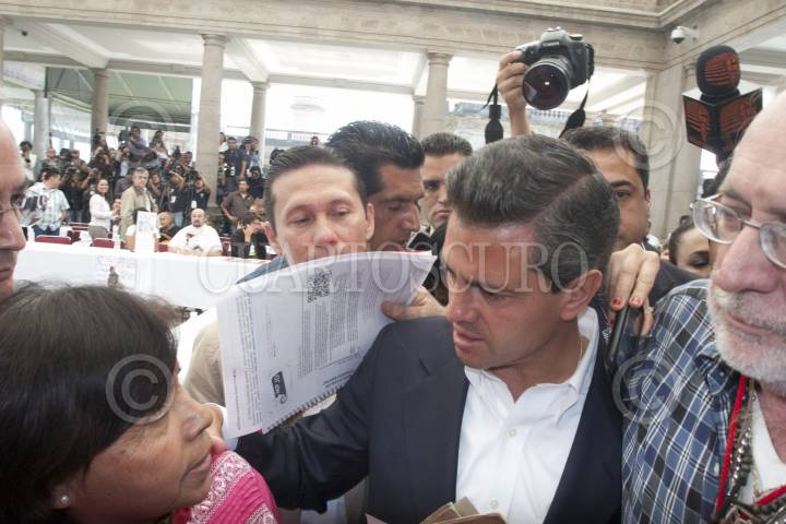 MÉXICO, D.F., 28MAYO2012.- Enrique Peña Nieto, candidato presidencial de la Coalición Compromiso Por México, se reunió con el Movimiento por la Paz Con Justicia y Dignidad, encabezado por Javier Sicilia. Al final fue increpado por Trinidad Ramírez, del Frente de los Pueblos en Defensa de la Tierra, de San Salvador Atenco, a quien Peña Nieto le pidió disculpas, en respuesta la esposa de Ignacio del Valle, lider de los ejidatarios, le dijo que no se las recibía, que ella quería justicia para las mujeres violadas en la intervención policial en 2006 en San Salvador Atenco. FOTO: JUAN PABLO ZAMORA /CUARTOSCURO.COM