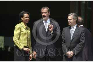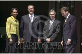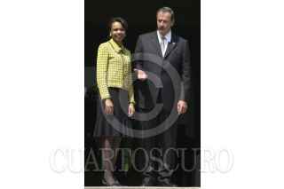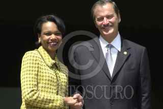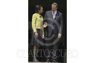 MEXICO, D.F. 10MARZO2005.- Condoleezza Rice, secretaria de Estado de los Estados Unidos de Norteamérica, fue recibida por Vicente Fox Quesada, primer mandatario mexicano, en la escalinata de la residencia oficial de los pinos. FOTO: Iván Stephens/CUARTOSCURO.COM