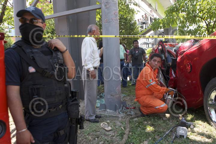 VILLAHERMOSA, TABASCO, 30MAYO2012.- Un joven perdió la vida cuando se impacto a bordo de su camioneta tipo pick ups contra un poste de concreto que sostiene un puente peatonal al ir huyendo de sus secuestradores. Los hechos acontecieron sobre el bulevar Adolfo Ruiz Cortinez de la colonia Tabasco Dos Mil, donde autoridades policiacas acordonas el área. FOTO: MARCO POLO GUZMÁN HERNÁNDEZ /CUARTOSCURO.COM