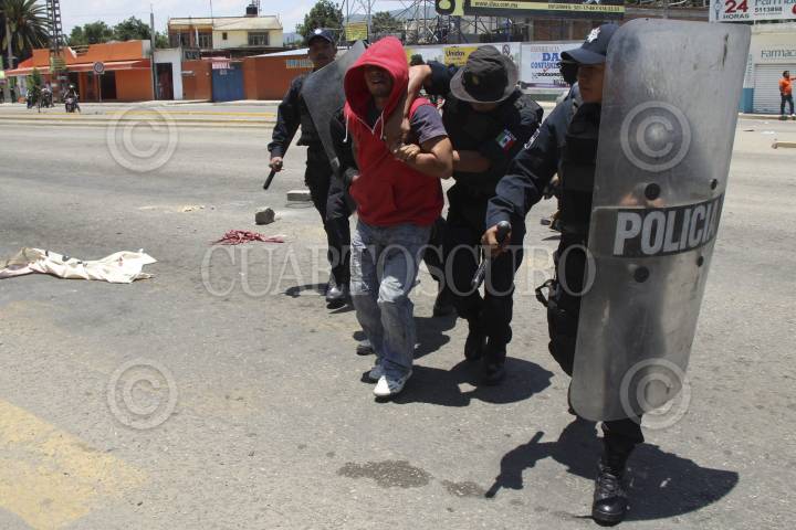 OAXACA, OAXACA, 30MAYO2012.- Elementos de la Policía Estatal desalojaron a los integrantes de la Confederación Obrera Nacional de la Construcción (CONCRETO) Siglo XXI, quienes bloquearon el crucero de Cinco Señores en la ciudad de Oaxaca. El operativo estuvo bajo el mando del comisionado de la Policía Estatal, César Cruz Alfaro, quien se encuentra suspendido del cargo desde el mes de febrero. FOTO: ARTURO PÉREZ ALFONSO /CUARTOSCURO.COM
