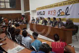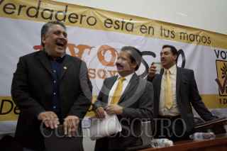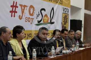 MÉXICO, D.F., 01JUNIO2012.- Los perredistas Guadalupe Acosta Naranjo, Luis Sánchez, y Camerino Márquez, ofrecieron una conferencia de prensa en la cual anunciaron el movimiento "Yo soy del sol", en la cual miembros fundadores del PRD intensificarán sus acciones a favor de la campaña del candidato presidencial Andrés Manuel López Obrador, quien esta semana repunto en las encuestas y se encuentra muy cerca de su contrincante priista. Los participantes señalaron que se inspiraron en el movimiento estudiantil "Yo soy 132". FOTO: MOISÉS PABLO /CUARTOSCURO.COM