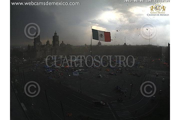 MÉXICO, D.F., 01JUNIO2012.- Un fenómeno meteorológico de vientos cruzados generó la tarde de hoy un tornado que azoto el centro de la ciudad, que arrasó con el campamento que mantenian maestros de la CNTE, lo que dejó por lo menos 27 personas lesionadas. El tornado originó a su paso rachas de mas de 50Km por Hora que dejó la caida de varios arboles y un espectacular en la calle de Topacio y Fray Servando Teresa de Mier. FOTO: TWITTER /CUARTOSCURO.COM