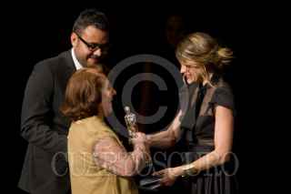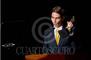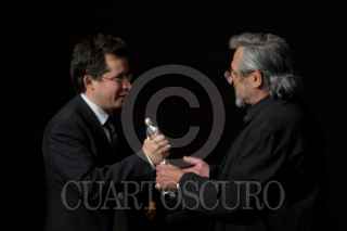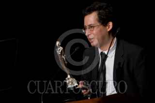 MÉXICO, D.F., 02JUNIO2012.- El productor de cine, Rodrigo Herranz se llevó el Ariel a mejor películ por la cinta "La Pastorela" la noche de hoy en la 54 entrega de los Arieles la noche de hoy en el Palacio de Bellas Artes. La estatuilla fue entregada por el Director de la Academia, Carlos Carrera. FOTO: FRANCISCO RODRÍGUEZ /CUARTOSCURO.COM
