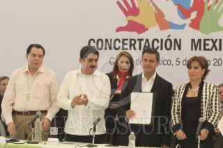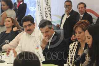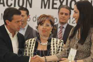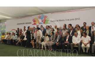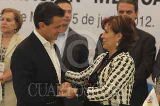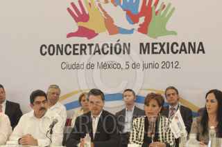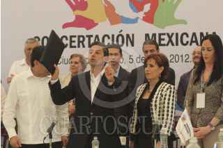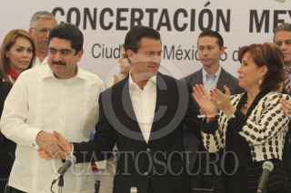 MÉXICO D.F., 05JUNIO2012.- Enrique Peña Nieto, candidato a la presidencia de la coalición “Compromiso por México” acompañado de, Rosario Robles, durante la firma del plan de Concertación Mexicana con exdirigentes nacionales y militantes de los partidos de la Revolución Democrática y Acción Nacional. FOTO: SAÚL LÓPEZ /CUARTOCURO.COM