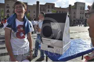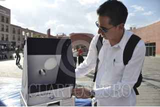 ZACATECAS, ZACATECAS, 05JUNIO2012.-Observación del tránsito del planeta Venus entre la Tierra y el Sol en la Plaza Bicentenario, en la que personal del Museo de Ciencias de la Universidad Autónoma de Zacatecas puso a disposición del público dispositivos para observarlo de manera segura. FOTO: JAIME ROBLEDO /CUARTOSCURO.COM