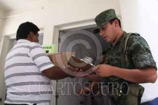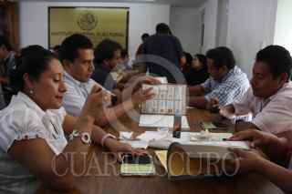 OAXACA, OAXACA, 07JUNIO2012.- La noche de este miércoles fueron entregadas en las juntas distritales 09 y 08, con cabecera en los municipios de Santa Lucía del Camino y Oaxaca de Juárez, las boletas electorales que serán utilizadas el proceso del primero de julio, fecha que se eligirán Presidente de la República, Senadores y Diputados Federales; para Oaxaca se han destinado poco más de ocho millones de papeletas. El vehículo encargado de la transportación fue vigilado por elementos del Ejército Mexicano y este jueves dio inicio el proceso de sellado de las boletas, el cual concluirá el próximo 9 de junio, tras lo cual se resguadarán en las bodegas de las juntas distritales para ser repartidas cinco días antes de la elección. FOTO: ARTURO PÉREZ ALFONSO /CUARTOSCURO.COM