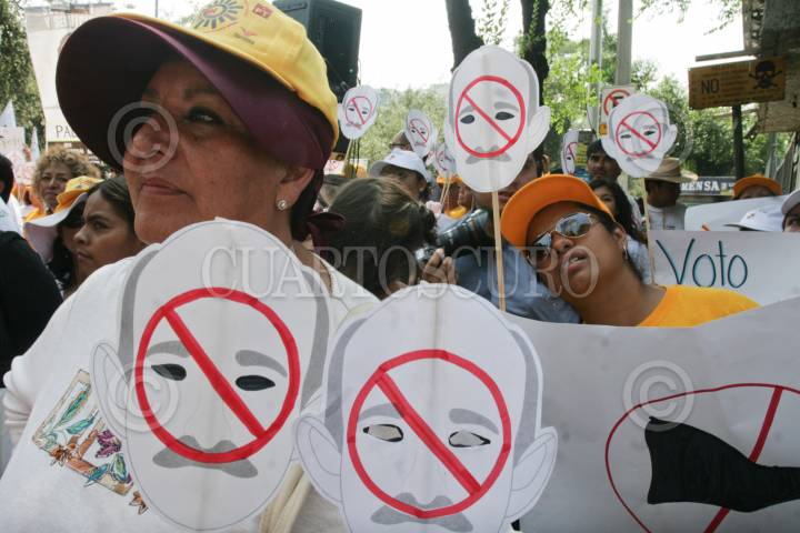 MÉXICO, D.F. 08JUNIO2012.-Simpatizantes de Andrés Manuel López Obrador, candidato del Movimineto Progresista acudieron al Instituto Federal Electoral (IFE), para manifestarse en contra de la postura de ese organo electoral respecto a los spots propagandísticos, que serán transmitidos a partir del domingo, y los cuales consideran estan editados y atentan contra la limpieza de los comicios . FOTO: JUAN PABLO ZAMORA /CUARTOSCURO.COM