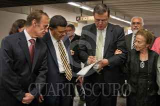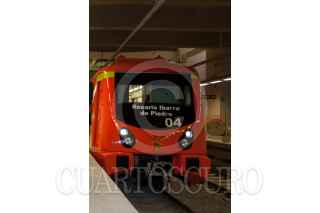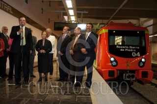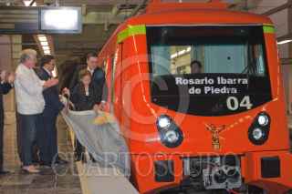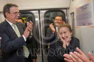 MÉXICO, D.F. 12JUNIO2012.- Marcelo Ebrard, jefe de Gobierno del DF, dió el nombre de Rosario Ibarra De Piedra a uno d elos trenes que correran por la línea 12 del metro. Al evento asistió la luchadora social por los desaparecidos y senadora por el PRD, Rosario Ibarra, el director general del Metro, Francisco Bojorquez, entre otros. Ebrard anunció que la línea 12 será abierta al público de manera gratuita para familiarizarse con ella el próximo domingo. Se abriran solo las estaciones Periférico, Eje Central y Mixcoac. FOTO: JUAN PABLO ZAMORA /CUARTOSCURO.COM