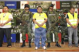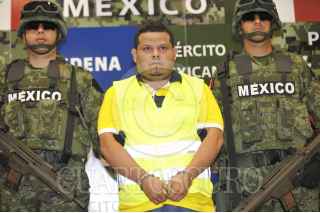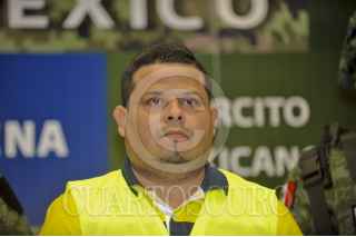 MÉXICO, D.F., 14JUNIO2012.- Gregorio Villanueva Salas, conocido como “El Zar de la Piratería”, fue presentado ante los medios de comunicación por soldados del ejercito mexicano en las Instalaciones de la SIEDO al ser uno de los presuntos operadores de "El Lazca" y responsable de los ataques con granada a escuelas, medios de comunicación, negocios e instalaciones militares a partir del 31 de mayo en la ciudad de Matamoros, Tamaulipas. En la presentación figuraban otros tres sujetos presentados como, Rodolfo Chan Cornejo, "El Rudy"; Christian Miguel Navarrete González, "El Christian"; y Rubén Darío Martínez Alvarado "El Chato". FOTO: IVAN MENDEZ /CUARTOSCURO.COM