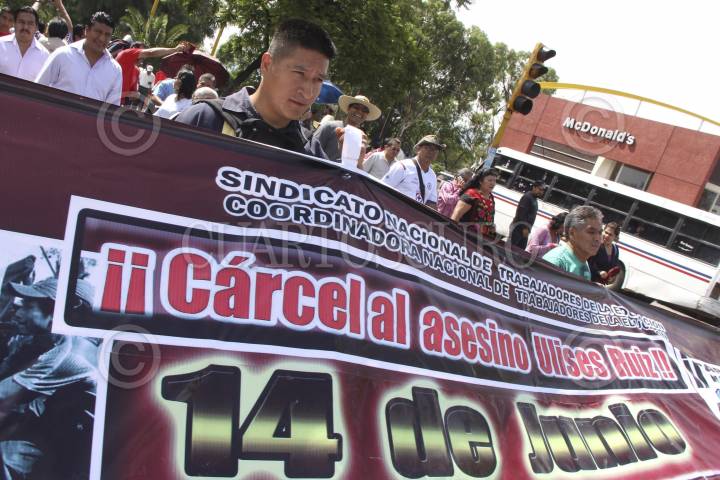 OAXACA, OAXACA, 14JUNIO2012.- Maestros de la Sección 22 del SNTE marcharon por las calles para conmemorar el sexto aniversario del desalojo fallido realizado en su contra por el ex gobernador del Estado, Ulise Ruiz Ortiz. Solamente el 20 por ciento de la membresía participó en la actividad en la que retiraron propaganda electoral. FOTO: ARTURO PÉREZ ALFONSO /CUARTOSCURO.COM