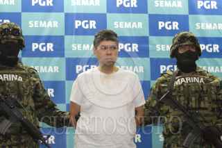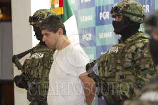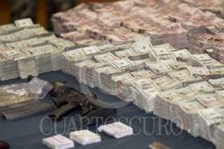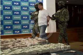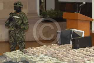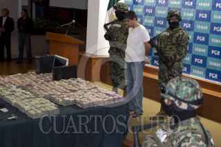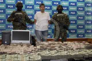 MÉXICO, D.F. 15JUNIO2012.- Personal de la Marina Armada de México, presento en las instalaciones de la SIEDO a Eric Jovan Lozano Díaz alias “Chucho” presunto operador financiero de Miguel Ángel Treviño Morales alias “Z 40” quien fue detenido en una casa de seguridad en Nuevo Laredo, Tamaulipas y quien mantenía en su poder 36 millones 111mil, 650 pesos además de un millón 48 mil, 919 dólares americanos, el asegurado dio a conocer que en su oficina cerca del lugar de la detención tenia guardado más dinero durante la revisión a citado lugar fueron localizados otros 5 millones de pesos. También le fueron aseguradas 10 dosis de polvo blanco con las características de la cocaína, dos armas largas, un arma corta, alrededor de 300 cartuchos útiles de diferentes calibres. FOTO: GUILLERMO PEREA /CUARTOSCURO.COM