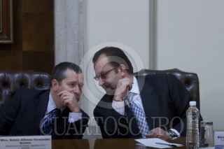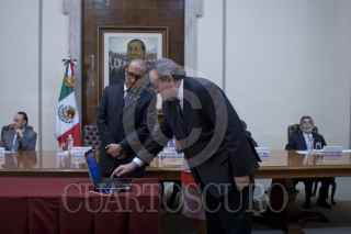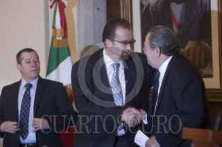 MÉXICO, D.F., 15UNIO2012.- El Subsecretario de Enlace Legislativo, Rubén Alfonso Fernández Aceves, el Mtro Mony de Swan, Presidente de la Comisión Federal de Telecomunicaciones y el Subsecretario de Población, Migración y Asuntos Religiosos se despiden despues de prescenciar la mañana de hoy en el salón Juárez de la Secretaria de Gobernación el inicio del programa de destrucción de datos del programna RENAUT. FOTO: FRANCISCO RODRÍGUEZ /CUARTOSCURO.COM