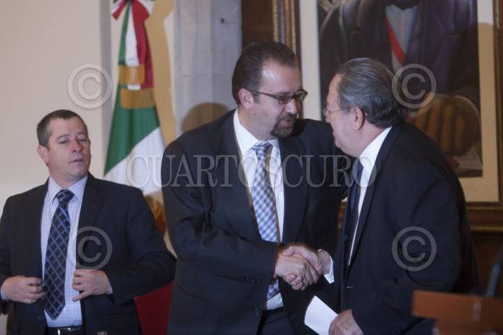MÉXICO, D.F., 15UNIO2012.- El Subsecretario de Enlace Legislativo, Rubén Alfonso Fernández Aceves, el Mtro Mony de Swan, Presidente de la Comisión Federal de Telecomunicaciones y el Subsecretario de Población, Migración y Asuntos Religiosos se despiden despues de prescenciar la mañana de hoy en el salón Juárez de la Secretaria de Gobernación el inicio del programa de destrucción de datos del programna RENAUT. FOTO: FRANCISCO RODRÍGUEZ /CUARTOSCURO.COM