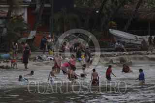 PUERTO ESCONDIDO, OAXACA, 16JUNIO2012.- Bañistas locales y extranjeros desobedecen las indicaciones de la capitanía de puerto y pasean por las playas de Puerto Escondido, tanto la Bahía Principal como en la playa de Zicatela. La capitanía no ha levantado la bandera roja en la zona de Puerto Escondido. FOTO: ARTURO PEREZ ALFONSO /CUARTOSCURO.COM
