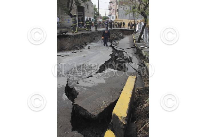 MÉXICO, D.F., 18JUNIO2012.- Bomberos de la Ciudad de México y elementos de Protección Civil del Distrito Federal, acordonaron la zona donde se registro un hundimiento de aproximadamente 25 metros en la calle Norte 29 y la avenida Industriales, en la colonia Moctezuma segunda sección. FOTO: SAÚL LÓPEZ /CUARTOSCURO.COM