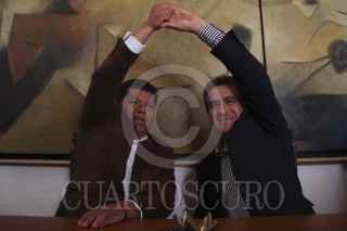 OAXACA, OAXACA, 19JUNIO2012.- Joaquín Ruiz Salazar (izq.) Candidato al Senado por el Partido Verde Ecologista de México (PVEM) declinó esta tarde a favor de Diódoro Carrasco Altamirano (der.) aspirante al Senado por el Partido Acción Nacional (PAN). Ambos ofecieron una conferencia de prensa en la que Ruiz Salasar reconoció no contar con el aval de su partido, sin embargo, aseguró es la mejor elección que pudo hacer en beneficio de Oaxaca. FOTO: ARTURO PÉREZ ALFONSO /CUARTOSCURO.COM