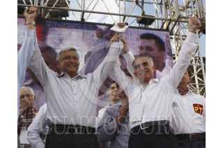 MONTERREY, NUEVO LEÓN, 20JUNIO2012.- Andrés Manuel López Obrador, candidato presidencial por los partidos PT, PRD, Y Movimiento Ciudadano, llevó a cabo su cierre de campaña oficial en la ciudad ante miles de simpatizantes, entre los asistentes al evento estuvieron varios candidatos locales por los diversos partidos, así como el empresario regiomontano Alfonso Romo, quien es considerado uno de los principales soportes económicos en la camapaña. FOTOS: PEDRO KRISTIAN LÓPEZ / CUARTOSCURO.COM