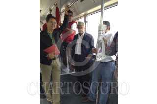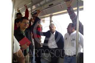 MÉXICO, D.F., 22JUNIO2012.- Andrés Manuel López Obrador, se transporta en el camión al interior del Aeropuerto para tomar el avión que lo trasladará la ciudad de Acapulco. FOTO: ELEAZAR GOMEZ /CUARTOSCURO.COM