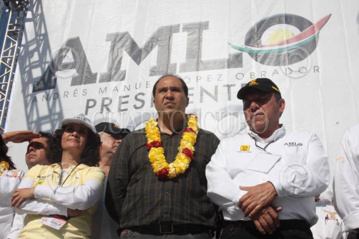 MORELIA, MICHOACÁN, 25JUNIO2012.- Andrés Manuel López Obrador, candidato de la Coalición Movimiento Progresista a la rpesidencia de la república, encabezó un cierre de campaña en la capital del estado. Lázaro Cárdenas Batel, exgobernador del estado; y Jesús Zambrano Grijalva, dirigente nacional del PRD; estuvieron presentes en el mitin. FOTO: IVÁN STEPHENS /CUARTOSCURO.COM