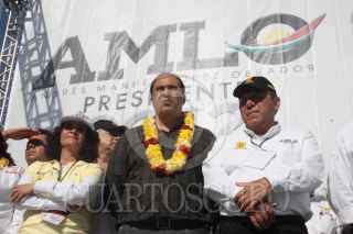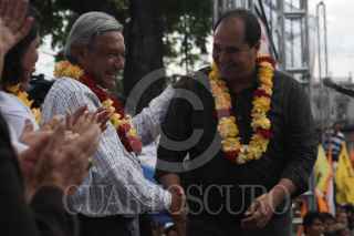 MORELIA, MICHOACÁN, 25JUNIO2012.- Andrés Manuel López Obrador, candidato de la Coalición Movimiento Progresista a la rpesidencia de la república, encabezó un cierre de campaña en la capital del estado. Lázaro Cárdenas Batel, exgobernador del estado; y Jesús Zambrano Grijalva, dirigente nacional del PRD; estuvieron presentes en el mitin. FOTO: IVÁN STEPHENS /CUARTOSCURO.COM