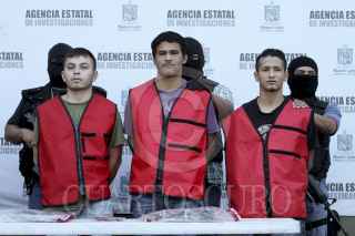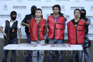 MONTERREY, NUEVO LEÓN, 27JUNIO2012.- La Agencia Estatal de Investigaciones de Nuevo León presentó esta mañana a tres presuntos secuestradores, quienes relacionan con el plagio y muerte de los cuñados del dirigente estatal del PRI en la entidad. Un cuarto integrante de la banda es menor de edad. Los detenidos son Francisco García Martínez de 21 años, Juan Manuel de 16 años, Luis Villarreal Vite de 29 años y Carlos Marroquín Vite de 27 años. FOTO: GABRIELA PÉREZ MONTIEL /CUARTOSCURO.COM