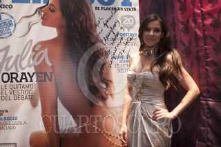 MÉXICO, D.F., 27JUNIO2012.- Julia Orayen, la playmate y exedecán del primer debate presidencial, presentó en conferencia de prensa el número 117 de la afamada revista en un café al sur de la ciudad. Durante la conferencia comentó que el celebre vestido blanco que llevó el día del debate será subastado y lo obtenido será donado a una fundación, además se declaró en contra de las corridas de toros y la compra de mascotas. FOTO: FRANCISCO RODRÍGUEZ /CUARTOSCURO.COM