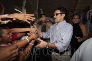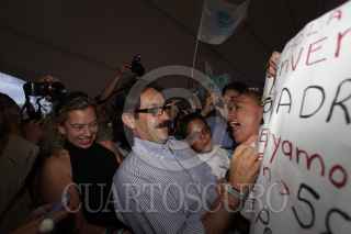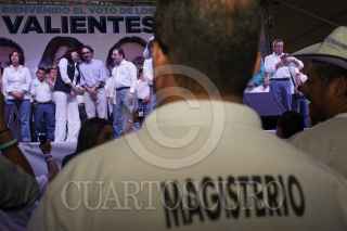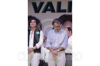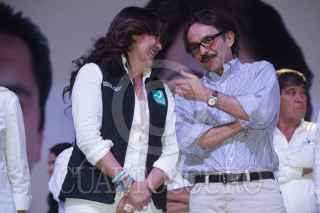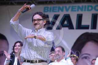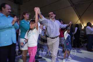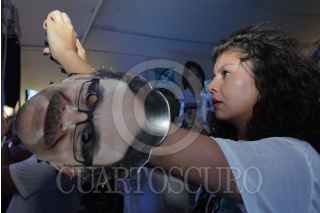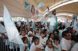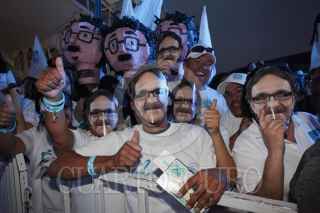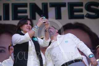 AGUASCALIENTES, AGUASCALIENTES 27 DE JUNIO2012.- La secretaría general de Nueva Alianza, Mónica Arreola Gordillo, e hija de la dirigente Magisterial Elba Esther Gordillo, sostiene una máscara de Gabriel Quadri De La Torre, candidato presidencial de Nueva Alianza, quien cerró su campaña en la explanada de la Plaza Patria de esta ciudad. FOTO: JUAN PABLO ZAMORA /CUARTOSCURO.COM