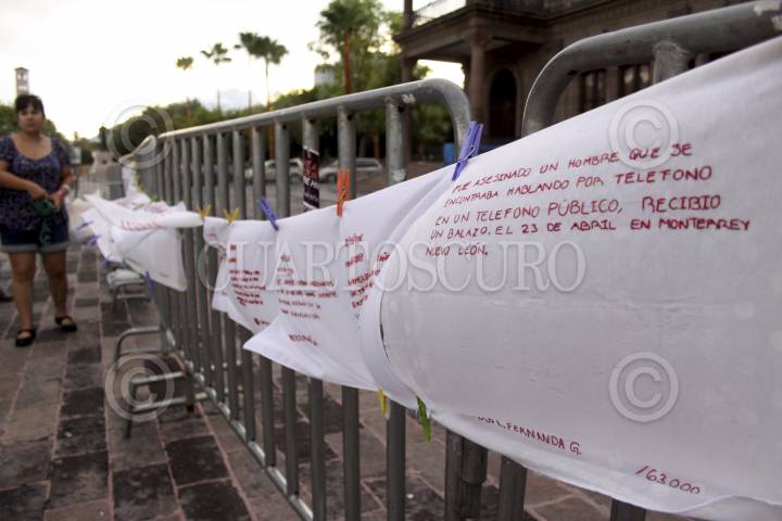 MONTERREY, NUEVO LEÓN, 30JUNIO2012.- Un grupo de madres de desaparecidos y secuestrados se reúnen cada semana en el centro de la ciudad de Monterrey para mostrar los tejidos que cuentan la historia de las víctimas. Bordando por la paz es un colectivo que inició en Guadalajara. FOTO: GABRIELA PÉREZ MONTIEL /CUARTOSCURO.COM