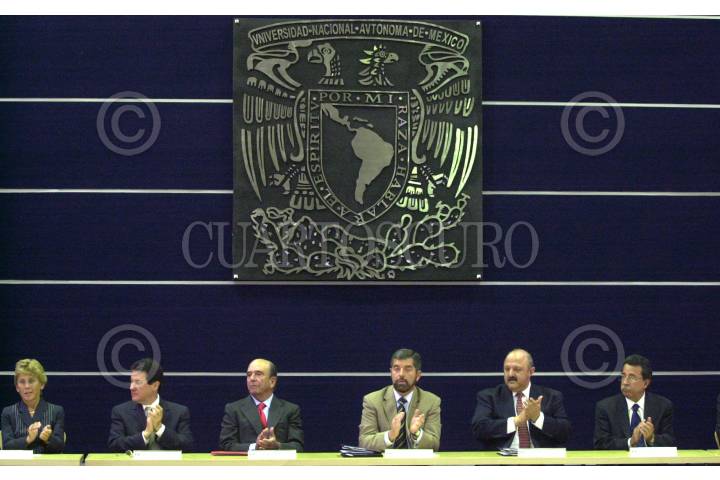 MEXICO, D.F. 30MARZO2005.- Emilio Botín, presidente del Grupo SANTANDER, Juan Ramón de la Fuente, rector de la UNAM, y Reyes Tamez Guerra, secretario de Educación Pública, estuvieron presentes en la ceremonia protocolaria de inicio del espacio común de educación superior en México y el programa de movilidad universitaria de las macrouniversidades de América Latina y el Caribe en las instalaciones de la UNAM. FOTO: Iván Stephens/CUARTOSCURO.COM