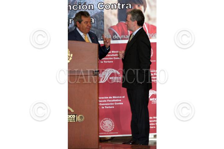 MEXICO, D.F., 30MARZO2005.- Santiago Creel, secretario de Gobernación y Porfirio Muñoz Ledo, durante la ceremonia de Incorporación de México al Protocolo Facultativo de la Convención Contra Tortura, en la residencia de los Pinos. FOTO: Moisés Pablo/CUARTOSCURO.COM