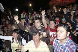 MÉXICO, D.F., 01JULIO2012.- Seguidores del candidato del Movimiento Progresista Andrés Manuel López Obrador, se dieron cita en el hotel en donde el tasbasqueño ofreció una conferencia de prensa en la cual anunció que no fijará postura antes de conocer el conteo final de las elecciones, el resultado del Programa de Resultados Electorales Preliminares en donde le aventaja el candidato tricolor Enrique Peña Nieto. La gente lloró y grito consignas de apoyo en favor del abanderado de las izquierdas. FOTO: PAULINA LÓPEZ /CUARTOSCURO.COM