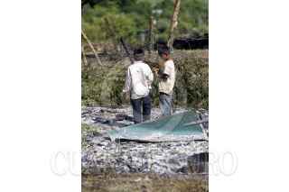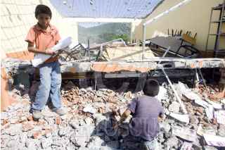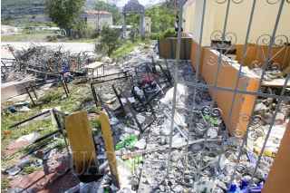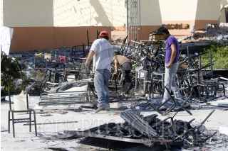 NUEVA JERUSALEM, MICHOACÁN, 06JULIO2012.- Jóvenes recogen lo poco que hay, después de los destrozos que otros habitantes realizaron en la escuela del pueblo. Según los informes, con marros, palas y fuego destruyeron los salones de clases, por un grupo religioso. FOTO: ALAN ORTEGA /CUARTOSCURO.COM