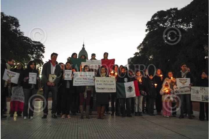 BUENOS AIRES, ARGENTINA, 07JULIO2012- En la Plaza del Congreso de la capital argentina, alrededor de 50 mexicanos se unieron a las marchas realizadas a nivel mundial para manifestar su descontento con el proceso electoral y también ante la imposición de Enrique Peña Nieto a la presidencia de México. FOTO: MARÍA VALTIERRA ANZA /CUARTOSCURO.COM